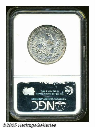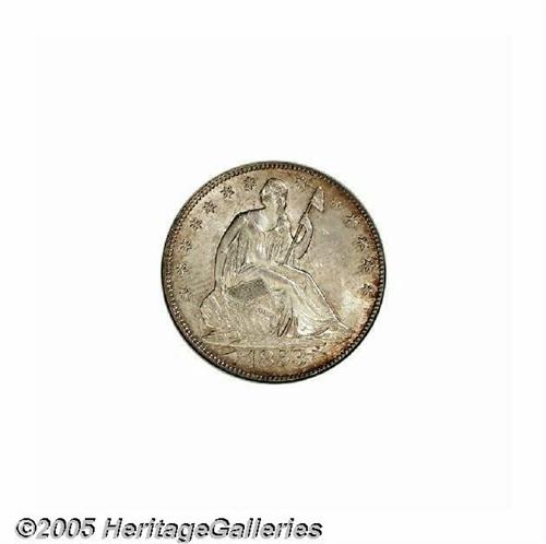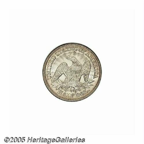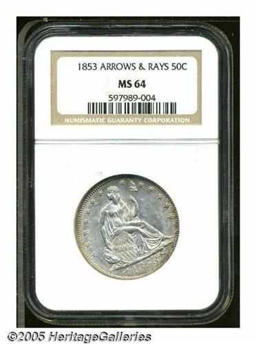 <B>1853<50C> Arrows and Rays MS64 NGC.</B></I> To speed up production of the 1853 Arrows and Rays Half Dollar production, the engraving department at the Philadelphia mint created a master die into which it impressed, among other features, the date, arrows, and rays. Since working dies were then sunk from this master die, there is no variation in the date placement between examples of this issue. Always in demand for type purposes, the 1853 is not as common in the finer Mint State grades as an original mintage of 3.5 million coins might suggest. Apparently, most examples were placed into circulation. This is a moderately toned representative with a typically strong strike for the type. The frosty surfaces display a few minute marks scattered about, none of which are serious or bothersome. Some die clashing is seen on the obverse. Population: 69 in 64, 36 finer (6/05).
