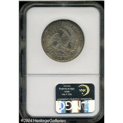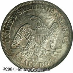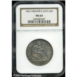 1853 50C Arrows and Rays MS64 NGC. To speed up pro <B>1853 50C Arrows and Rays MS64 NGC.</B></I> To speed up production of the 1853 Arrows and Rays Half Dollar production, the engraving department at the Philadelphia mint created a master die into which it impressed, among other features, the date, arrows, and rays. Since working dies were then sunk from this master die, there is no variation in the date placement between examples of this issue. Always in demand for type purposes, the 1853 is not as common in the finer Mint State grades as an original mintage of 3.5 million coins might suggest. Apparently, most examples were placed into circulation. This is a moderately toned representative with a typically strong strike for the type. We do, however, note some bluntness of detail near the upper obverse border. The frosty surfaces are devoid of singularly mentionable abrasions. Some notable die clashing is seen on each side. <BR><BR><B>Important notice:</B> Heritage usually auctions material at the rate of 200-250 lots per hour. On some occasions eBay Live bid software or the Internet may not be able to keep up with the pace of the auction. We recommend placing a realistic absentee bid now as insurance to avoid disappointment. Occasionally the auctioneer may eliminate or reject an eBay Live bid, and the auctioneer may also reopen a lot after the close of the eBay live bidding (usually because we missed an audience bid), and may reject your bid even if it shows you as the winning bidder. By bidding via eBay Live, you agree that Heritage may award the lot to another bidder at its sole discretion under the circumstances described above or any other reasonable circumstances. Since eBay bids are not shown to us until we open the lot on the floor, we treat those bids just like floor bids. In most cases the floor responds before the eBay bid is presented to us, due to Internet lag time, so for consistency we have made it a policy that floor bids are always considered first over tie eBay live bids. Also please note that all Heritage lots purchased through eBay Live carry a 20% Buyer's Premium. Please make sure you read the Terms and Conditions before you bid. This lot is being auctioned in conjunction with a live floor auction by Heritage Galleries & Auctioneers. All final auction and invoice information will be supplied by Heritage Galleries & Auctioneers, and all other information should be considered preliminary. Lot:6092