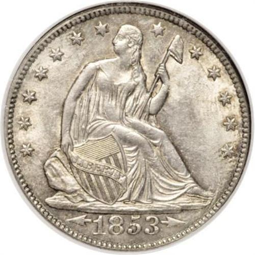<B>1853 50C Arrows and Rays MS64 NGC.</B></I> Always in demand for type purposes, the 1853 Arrows and Rays half dollar is not as common in the finer Mint State grades as the original mintage of 3.5 million coins might suggest. Apparently, most examples were placed into circulation. This is a moderately toned representative with a typically strong strike for the type, save for minor softness on the two uppermost star centers. The frosty surfaces are devoid of singularly mentionable abrasions. Some notable die clashing is seen on each side. Census: 83 in 64, 44 finer (1/08).<BR><BR><B>Coin Engraver:</B> Christian Gobrecht<BR><BR><b>Shipping:</b> Coins & Currency (<a target="_blank" href="http://www.heritageauctions.com/common/shipping.php">view shipping information</a>)