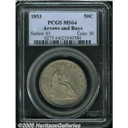 <B>1853 50C Arrows and Rays MS64 PCGS.</B></I> The Arrows and Rays design is a single year type coin that is in demand by date and type collectors. While the mintage was substantial, most went into circulation at a time when coinage was desperately needed. As a result, few high quality examples have survived. This Choice example is sharply struck and has good luster beneath a coating of gray-golden color over the obverse. The reverse has a mostly brilliant, silver-gray appearance.