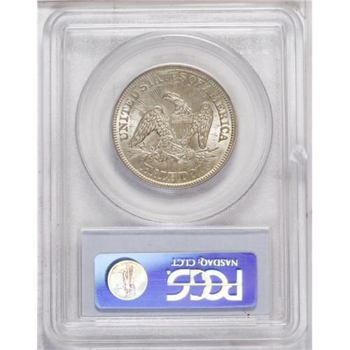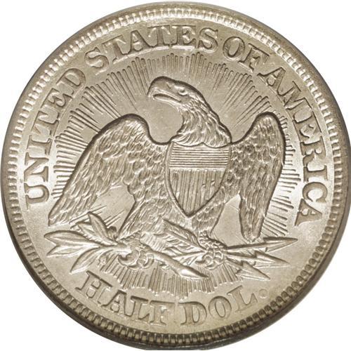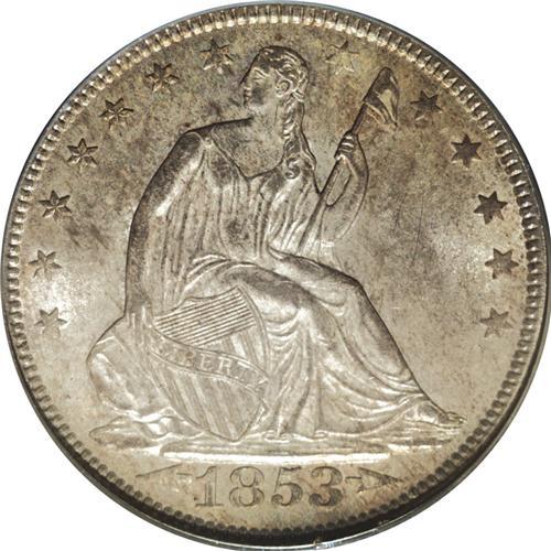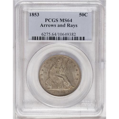 <B>1853<50C> Arrows and Rays MS64 PCGS.</B></I> The arrows and ray signified that these silver coins conformed to the new reduced-weight standard, which would make their melting unprofitable since the silver content was again less than the face value. More than 3.5 million pieces of this issue were coined, but PCGS has graded only 20 examples finer than this piece (7/06). The reverse is brilliant with a light golden cast; the obverse has a mellow copper-colored hue. The piece is well struck, save for the right-side stars, and essentially abrasion-free.