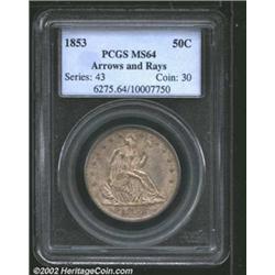 1853 50C Arrows and Rays MS64 PCGS. There are whispers of olive color here and there, but the outward appearance is one of even dove-gray patina. The toning is light enough to allow billowy mint frost to shine through at most angles, and the crisply impressed features are also readily evident. The Philadelphia Mint delivered 3.5 million Half Dollars of the new Arrows and Rays type in 1853. These coins were meant to replace the older, heavier examples that had been largely withdrawn from circulation and melted after gold was discovered in California. As a result, the 1853 Arrows and Rays, while common in worn grades, is a challenging date to locate in the finer Mint State grades. This is a coin that would make an impressive addition to a high grade type set. Important notice: We expect to be auctioning lots at the rate of 200-250 per hour. Sometimes eBay Premier live bid software cannot keep up with that pace, so we strongly recommend that you place a realistic proxy bid now as insurance to avoid disappointment. Also please note that all Heritage/CAA lots purchased through eBay Premier carry a 20% Buyer's Premium. Please make sure you read the Terms and Conditions.