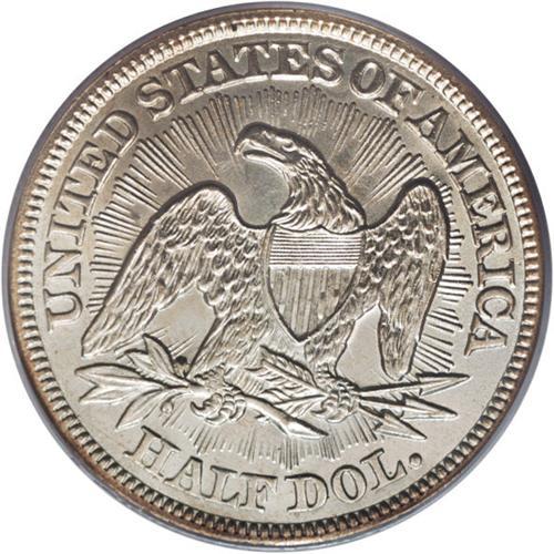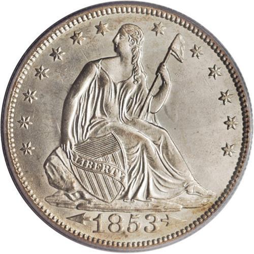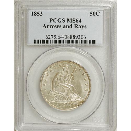 <B>1853 50C Arrows and Rays MS64 PCGS.</B></I> Traces of golden-brown toning appear at 12 and 5 o'clock on the obverse. The satiny surfaces are otherwise pearl-gray. A sharply struck example of this one-year design type with a few tiny marks on each side that keep the piece from Gem status. Population: 97 in 64, 20 finer (3/07).<BR><BR><b>Shipping:</b> Coins & Currency (<a target="_blank" href="http://www.heritageauctions.com/common/shipping.php">view shipping information</a>)