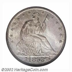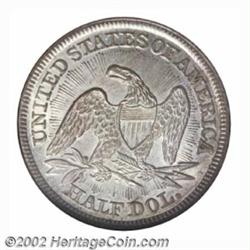 1853 50C Arrows and Rays MS65 NGC. Arrows and Rays Halves are abundant in circulated grades, and even lower grade Uncirculated examples can be found in any major auction. But Gems are curiously absent from auctions and dealers' show cases. This is a splendid and obviously original example that has light steel-gray surfaces with somewhat darker accents over the highpoints. A couple of marks are located on the lower area of the legs of Liberty, but these are insignificant and the overall surfaces are clean and problem-free with soft, frosted mint luster. Fully struck in all areas. Population: 18 in 65, 11 finer (7/02). Important notice: We expect to be auctioning lots at the rate of 200-250 per hour. Sometimes eBay Premier live bid software cannot keep up with that pace, so we strongly recommend that you place a realistic proxy bid now as insurance to avoid disappointment. Also please note that all Heritage/CAA lots purchased through eBay Premier carry a 20% Buyer's Premium. Please make sure you read the Terms and Conditions.