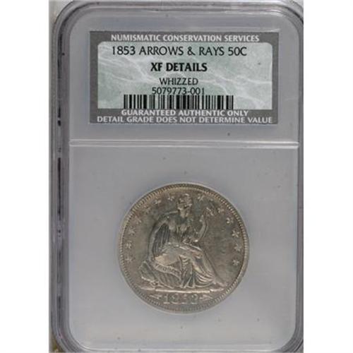 <B>1853 50C Arrows and Rays--Whizzed--NCS. XF Details.</B></I> NGC Census: (28/657). PCGS Population (55/648). Mintage: 3,532,708. Numismedia Wsl. Price for NGC/PCGS coin in XF40: $221. (#6275)<BR><BR><B>Coin Engraver:</B> Christian Gobrecht<BR><BR><b>Shipping:</b> Coins & Currency (<a target="_blank" href="http://www.heritageauctions.com/common/shipping.php">view shipping information</a>)