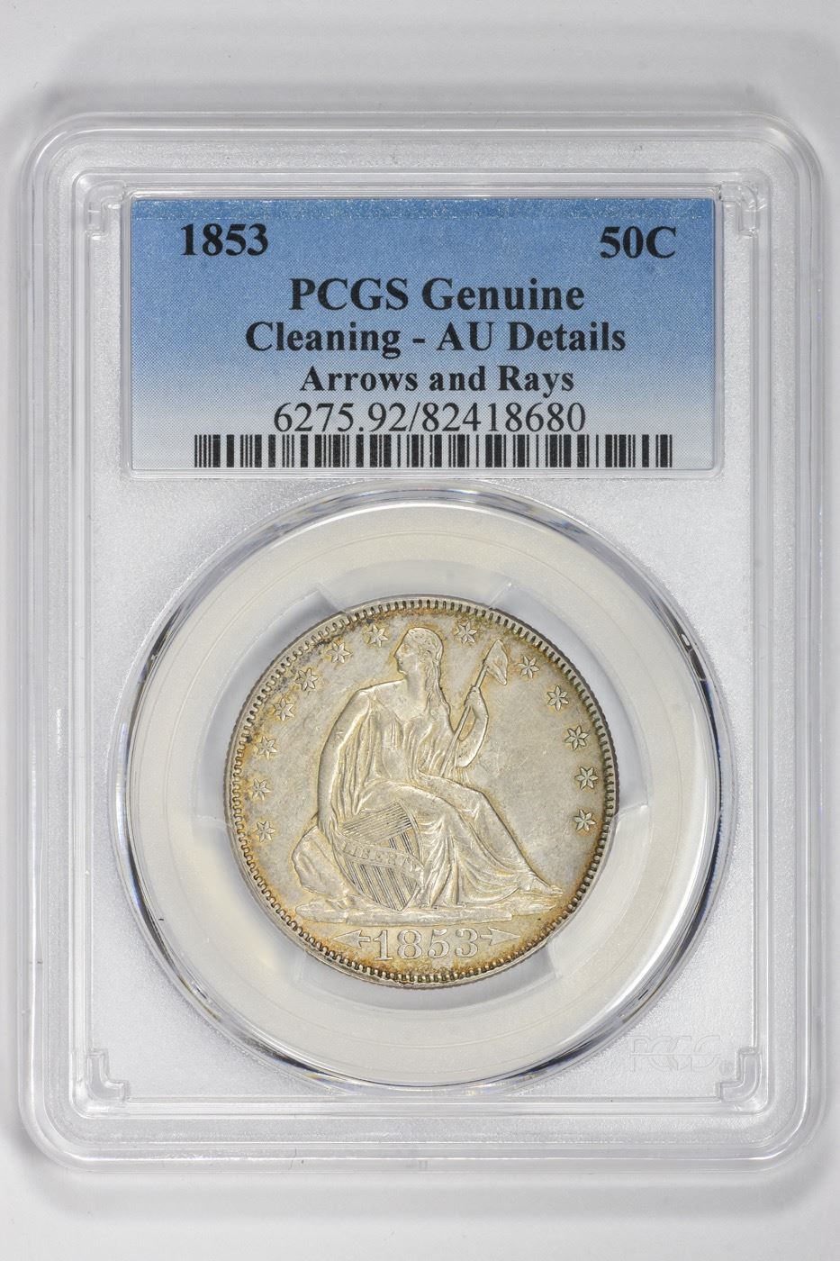 1853 50C Genuine Arrows and Rays Cleaning. AU Details PCGS