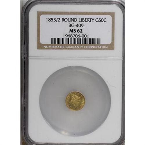 <B>1853/2 50C Liberty Round 50 Cents, BG-409, R.3, MS62 NGC.</B></I> NGC Census: (7/5). PCGS Population (35/26). (#10445)<BR><BR><b>Shipping:</b> Coins & Currency (<a target="_blank" href="http://www.heritageauctions.com/common/shipping.php">view shipping information</a>)