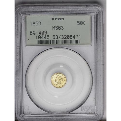 1853 50C Liberty Round 50 Cents, BG-409, R.3, MS63 PCG 1853[50C] Liberty Round 50 Cents, BG-409, R.3