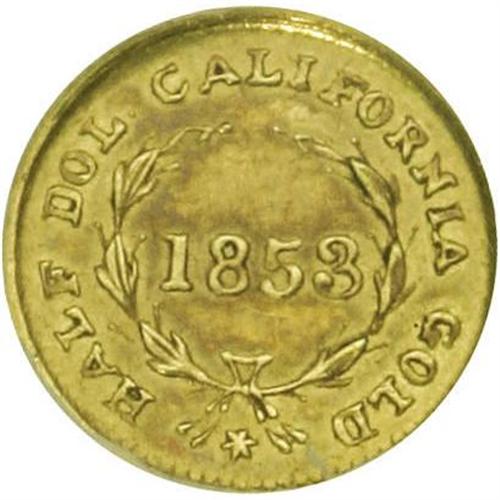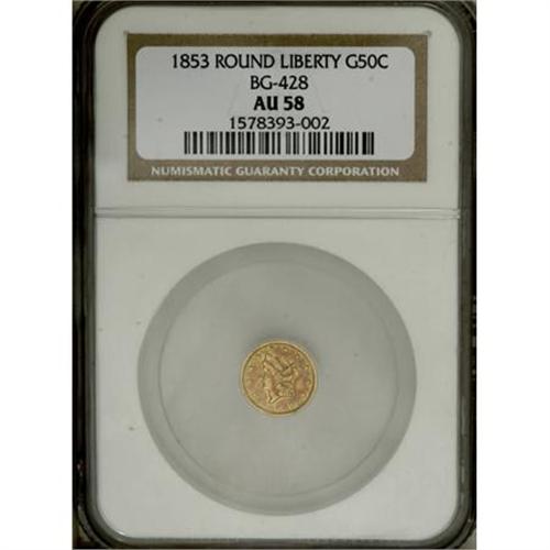 <B>1853 50C Liberty Round 50 Cents, BG-428, R.3, AU58 NGC.</B></I> NGC Census: (4/19). PCGS Population (61/147). (#10464)<BR><BR><b>Shipping:</b> Coins & Currency (<a target="_blank" href="http://www.heritageauctions.com/common/shipping.php">view shipping information</a>)