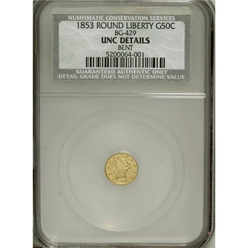<B>1853 50C Liberty Round 50 Cents, BG-429, Low R.4--Bent--NCS. Unc Details.</B></I> NGC Census: (0/13). PCGS Population (7/54). (#10465)<BR><BR><b>Shipping:</b> Coins & Currency (<a target="_blank" href="http://www.heritageauctions.com/common/shipping.php">view shipping information</a>)
