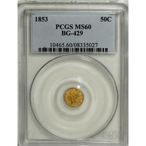 <B>1853 50C Liberty Round 50 Cents, BG-429, Low R.4, MS60 PCGS.</B></I> PCGS Population (7/54). NGC Census: (0/13). (#10465)<BR><BR><b>Shipping:</b> Coins & Currency (<a target="_blank" href="http://www.heritageauctions.com/common/shipping.php">view shipping information</a>)