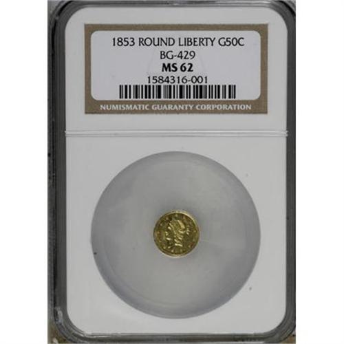 <B>1853 50C Liberty Round 50 Cents, BG-429, Low R.4, MS62 NGC.</B></I> NGC Census: (10/2). PCGS Population (38/9). (#10465)<BR><BR><b>Shipping:</b> Coins & Currency (<a target="_blank" href="http://www.heritageauctions.com/common/shipping.php">view shipping information</a>)