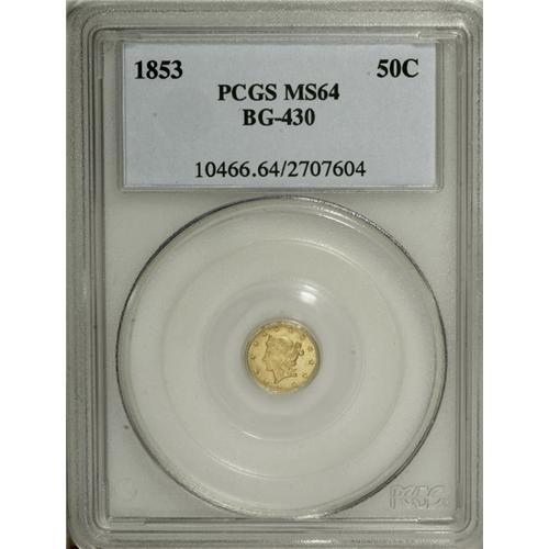 <B>1853 50C Liberty Round 50 Cents, BG-430, R.3, MS64 PCGS.</B></I> Pleasing lemon-yellow with a hint of green color. The surfaces are lightly reflective, as often found on higher grade examples of these fractional pieces. The reverse is rotated clockwise. This variety was illustrated in contemporary references from the mid to late 1850s.<BR><BR><b>Shipping:</b> Coins & Currency (<a target="_blank" href="http://www.heritageauctions.com/common/shipping.php">view shipping information</a>)