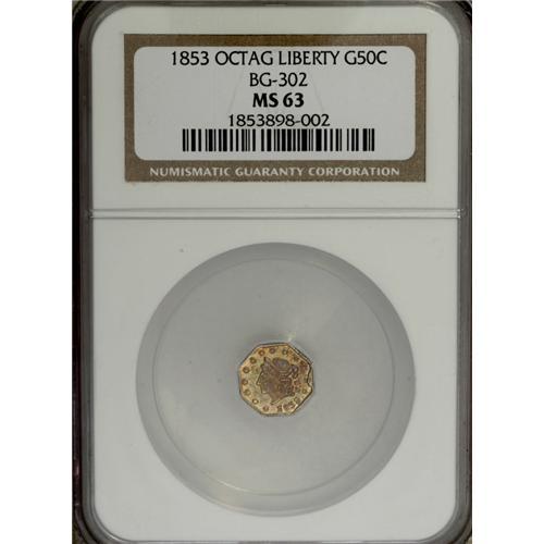 <B>1853 50C Octagonal Liberty Peacock Reverse 50 Cents, BG-302, Low R.4, MS63 NGC.</B></I> A medley of aqua-green, crimson, and orange-gold patination occupies both sides of this scarce and popular issue. This piece exhibits a retained cud rim break at the right obverse, meaning that it is State III according to Walter Breen and Ron Gillio (2003). Census: 1 in 63, 3 finer (12/06).<BR><I>From The Twin Hollows Collection, Part Two.</B></I><BR><BR><b>Shipping:</b> Coins & Currency (<a target="_blank" href="http://www.heritageauctions.com/common/shipping.php">view shipping information</a>)