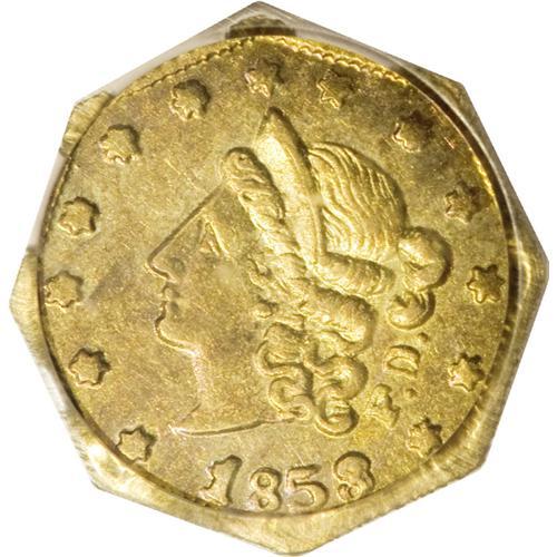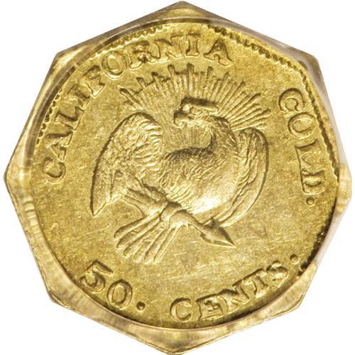 <B>1853 50C Peacock Reverse 50 Cents, BG-302, Low R.4, AU58 PCGS.</B></I> The Peacock reverse is one of the most famous fractional gold designs, since it stands out from the usual parade of wreaths that simulate the Federal gold dollar. The devices show scant evidence of wear, although the fields are slightly subdued. The obverse is rich ruby-red with hints of yellow-gold. The reverse is straw-gold.<BR><I>From The Diamond K Collection of California Fractional Gold.</B></I><BR><BR><b>Shipping:</b> Coins & Currency (<a target="_blank" href="http://www.heritageauctions.com/common/shipping.php">view shipping information</a>)