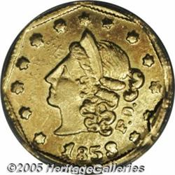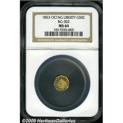 <B>1853 50C Peacock Reverse 50 Cents, BG-302, Low R.4, MS64 NGC.</B></I> The "Peacock" reverse half dollar is one of the most popular of all Period One designs. This piece has marginal reflectivity in the fields and appears to have been struck from rusted dies. A significant die cud is seen between 3 and 4 o'clock on the obverse rim. Bright yellow-gold coloration.