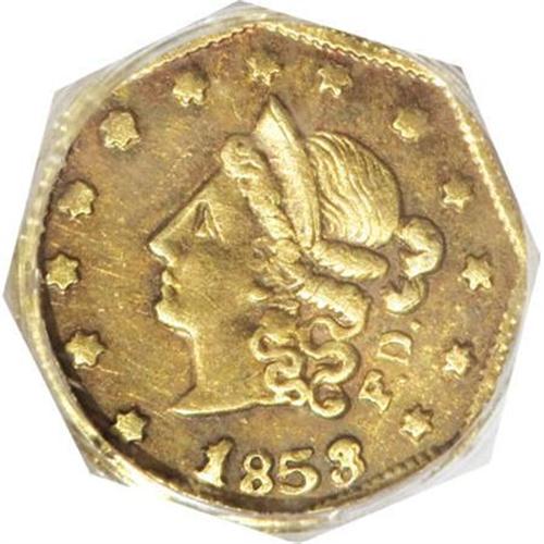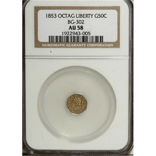 <B>1853 50C Peacock Reverse 50 Cents, BG-302, Low R.4, AU58 NGC.</B></I> Early die state, although a horizontal die crack has developed on the reverse from the claws to the border at right. Pale violet toning clings to the peripheral devices. Certainly not among the scarcer Period One gold fractionals, but one of the more popular issues because of its distinctive reverse.<BR><BR><b>Shipping:</b> Coins & Currency (<a target="_blank" href="http://www.heritageauctions.com/common/shipping.php">view shipping information</a>)