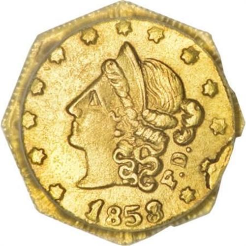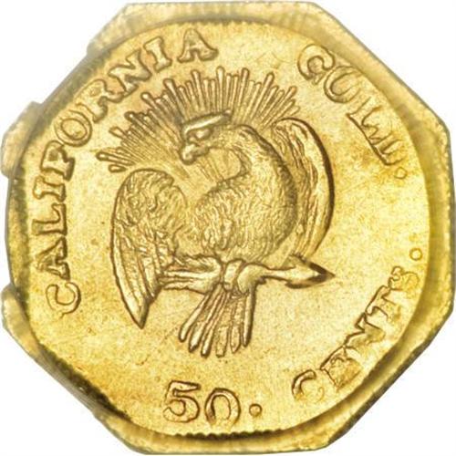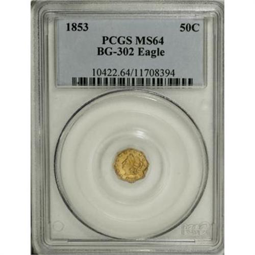<B>1853 50C Peacock Reverse Octagonal 50 Cents, BG-302, Low R.4, MS64 PCGS.</B></I> Die State IV with a prominent cud at 3 o'clock. This die state is listed as "rare" in the second edition of Breen-Gillio, which adds "one of the most popular types in this series." The F.D. initials beneath the bun are short for the maker, Frontier, Deviercy & Co. Satiny and unabraded with green-gold color and well struck types. Jay Roe's example, graded MS63 PCGS, auctioned for $5,000 in 2003. Population: 13 in 64, 2 finer (12/07).<BR><BR><b>Shipping:</b> Coins & Currency (<a target="_blank" href="http://www.heritageauctions.com/common/shipping.php">view shipping information</a>)