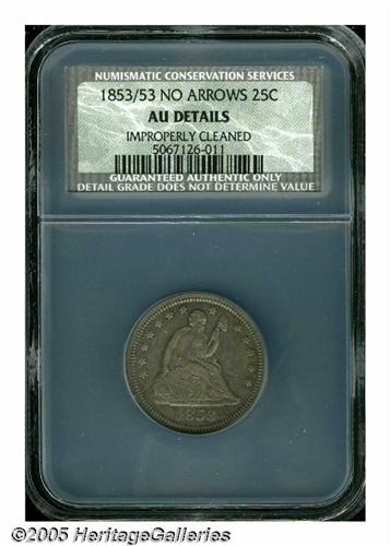 <B>1853/53<25C> No Arrows AU Details, Improperly Cleaned, NCS.</B></I> Breen-3988, doubling on the 5 and 3 in the date. Formerly called an 1853/2 overdate, but this is obviously incorrect as the final digits in the date clearly show repunching with the same numerals. A scarcer variety, both sides are a deep steel-gray and olive color with no mentionable abrasions.<BR><I>From The Empire State Collection.</B></I>