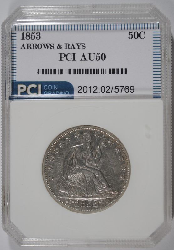 1853 ARROW & RAYS SEATED HALF DOLLAR, PCI AU,