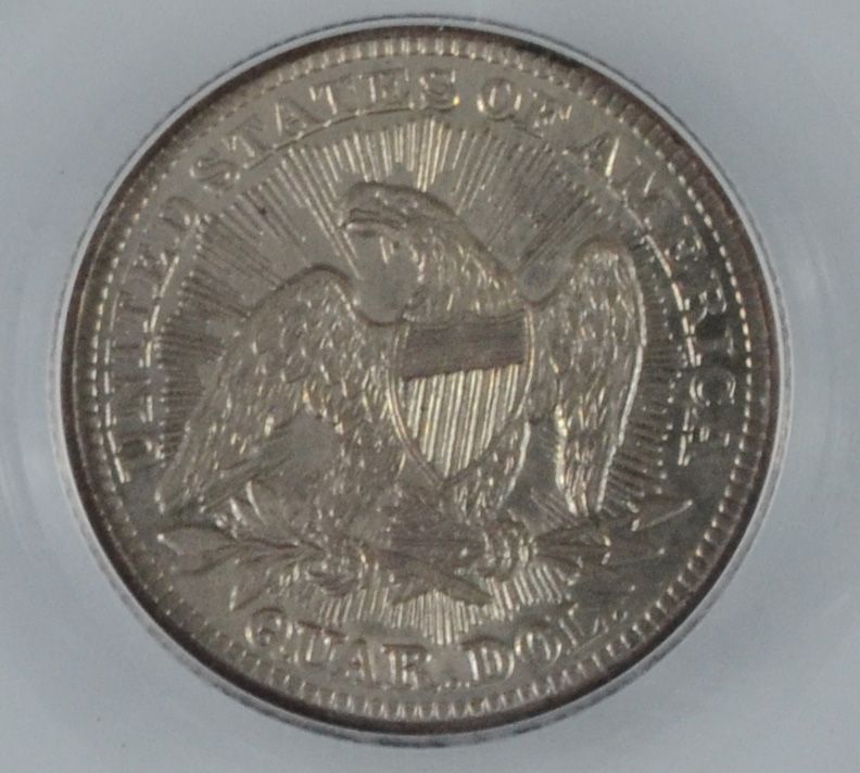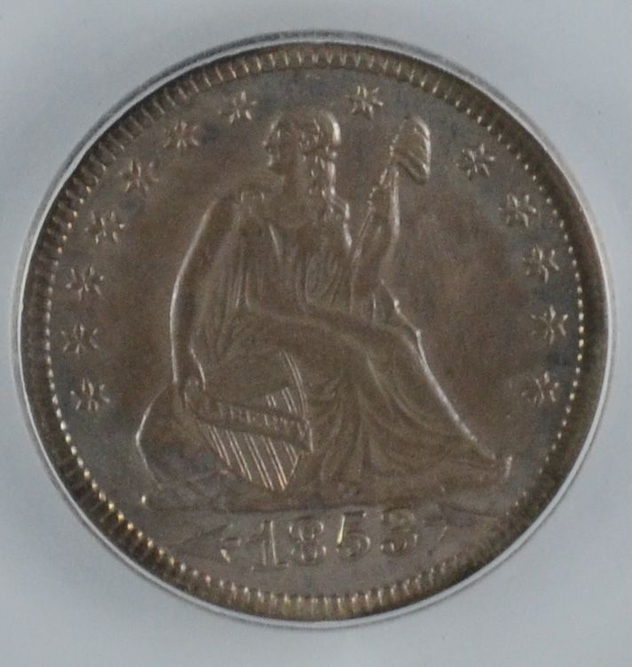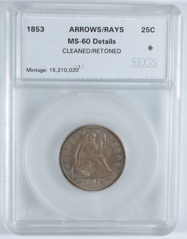 1853 ARROWS AND RAYS SEATED QUARTER, SEGS MS-60, RE-TONED RARE!!
