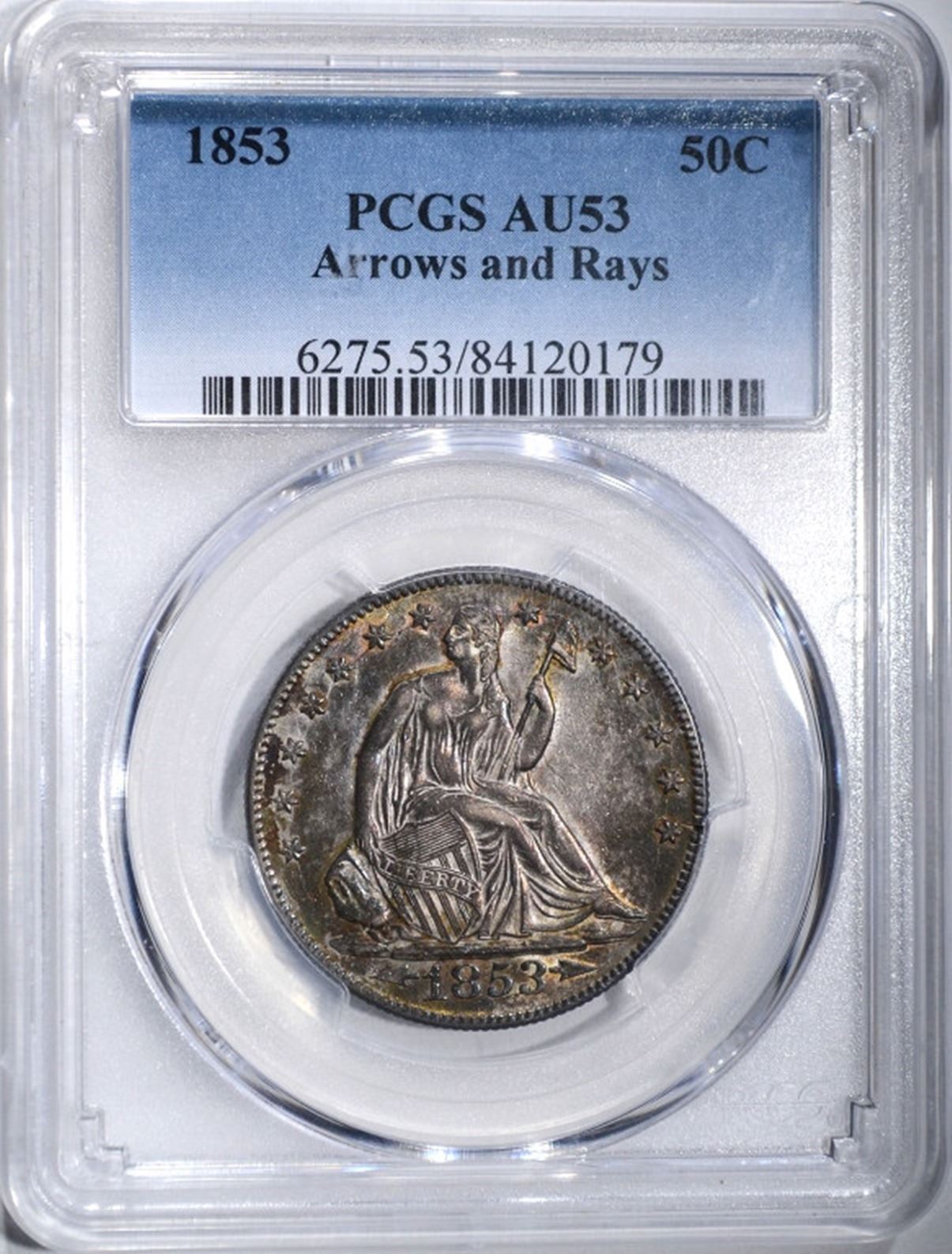 1853 ARROWS/RAYS SEATED HALF DOLLAR, PCGS AU-53