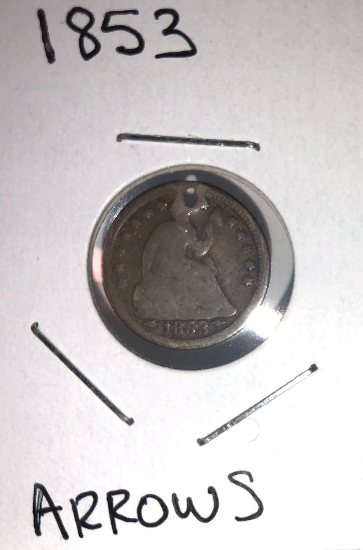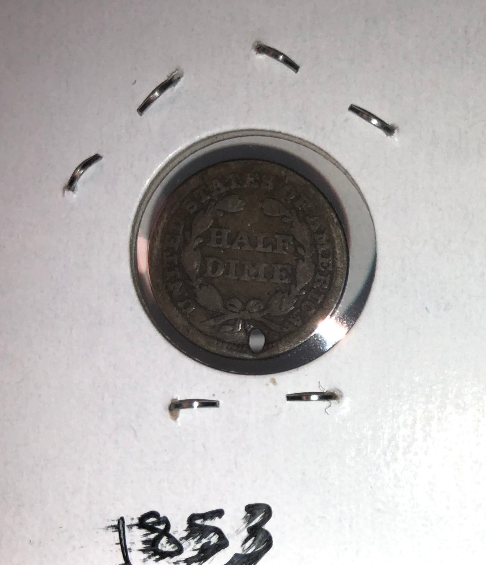 1853 'ARROWS' SEATED LIBERTY HALF DIME HOLED