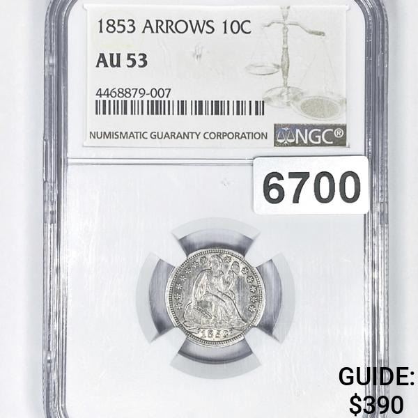 1853 Arrows Seated Liberty Dime NGC - AU53