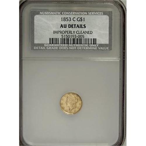 <B>1853-C G$1 --Improperly Cleaned--NCS. AU Details.</B></I> Variety 8-I. This sharp Charlotte Mint gold dollar has little if any wear, but the fields are cloudy from hairlines. A scant 11,515 pieces were struck.<BR><BR><B>Coin Engraver:</B> James B. Longacre<BR><BR><b>Shipping:</b> Coins & Currency (<a target="_blank" href="http://www.heritageauctions.com/common/shipping.php">view shipping information</a>)