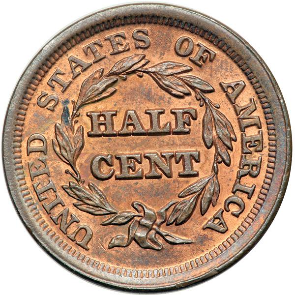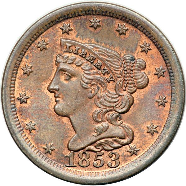 1853 C-1 R1 MS63+. Lustrous bluish steel and light olive brown faded down from mint color with more than a third of the mint color remaining, mostly on the reverse. Outstanding eye appeal for the grade, very close to MS64. The notable marks are a couple very faint abrasions on the chin and cheek, a speck of dark toning above star 4, and a splash of fine carbon on the leaf tip under the first S in STATES. M-LDS, Manley state 2.0. The dull bar down through the first T in STATES is faint, nearly gone, and a very subtle depression has formed in the field off the tip of the nose. Removed from a PCGS slab graded MS64RB (old green PCGS label included, #1228.64/6503579). Noyes photo #74333.