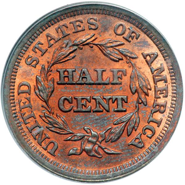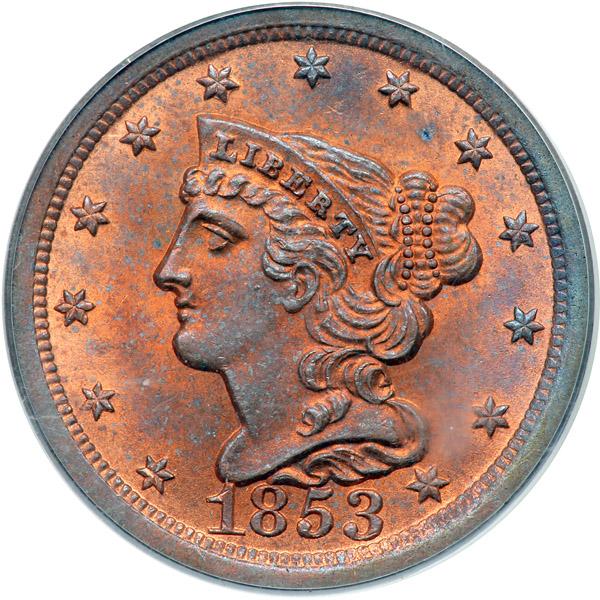 1853 C-1 R1. PCGS graded MS-64 Red & Brown. Choice lustrous mellowed mint red fading to bluish steel and olive on the highpoints with half the red remaining. Great cartwheel luster mixed with ample mint color combine to give this piece outstanding eye appeal. Would rate consideration for "gem" status except for faint traces of an old fingerprint on the lower half of the reverse. The best identifying mark is a light, shiny nick confined to the body of star 1. Breen and Cohen both noted that 1853 half cents are extremely rare with considerable original mint red remaining. Nicely struck E-MDS, Manley state 1.0. The dull bar down through the first T in STATES is clear and the fields are covered with microscopic radial die flowlines (which create the cartwheel luster). Our grade is consistent with the slab grade (old green PCGS label #1228.64/6503582).