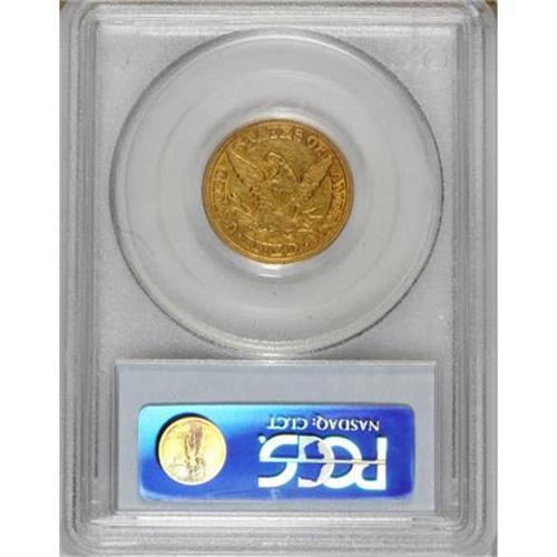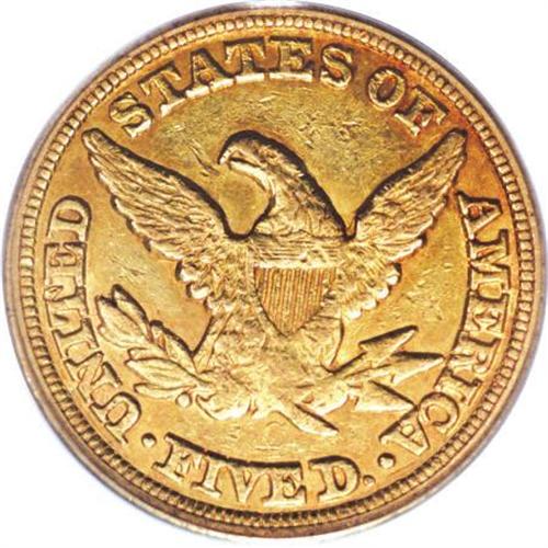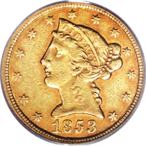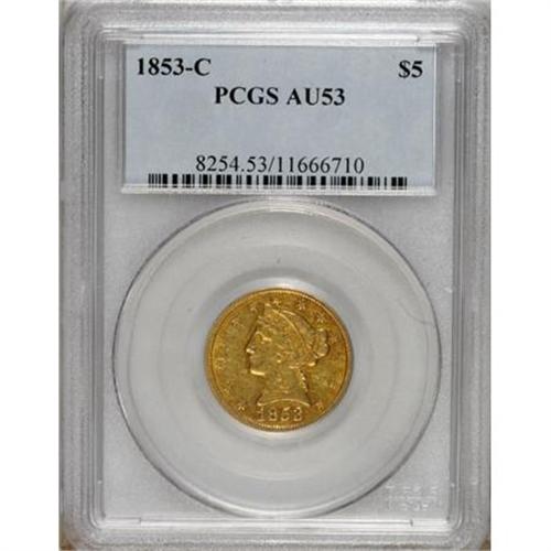 <B>1853-C $5 AU53 PCGS.</B></I> Variety 21-H. A lightly worn representative of this popular, comparatively available Charlotte issue, well-defined save for softness at the hair to the right of Liberty's eye and the eagle's claws. The softly lustrous yellow-orange surfaces have deeper color near the margins. Though the fields and devices display scattered abrasions, like many examples of later Charlotte gold, the overall effect is less distracting than on most pieces. Population: 14 in 53, 34 finer (5/07).<BR><BR><b>Shipping:</b> Coins & Currency (<a target="_blank" href="http://www.heritageauctions.com/common/shipping.php">view shipping information</a>)