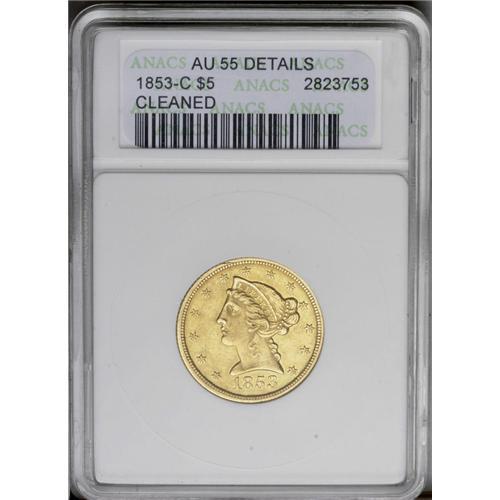 <B>1853-C<$5> AU55 ANACS.</B></I> Variety 20-H. This well struck but glossy green-gold Charlotte Mint survivor is hairlined on the field above the eagle, and a pair of thin scratches in the left obverse field requires mention. Scarce regardless of condition. <BR><BR><B>Important notice:</B> Heritage usually auctions material at the rate of 200-250 lots per hour. On some occasions eBay Live bid software or the Internet may not be able to keep up with the pace of the auction. We recommend placing a realistic absentee bid now as insurance to avoid disappointment. Occasionally the auctioneer may eliminate or reject an eBay Live bid, and the auctioneer may also reopen a lot after the close of the eBay live bidding (usually because we missed an audience bid), and may reject your bid even if it shows you as the winning bidder. By bidding via eBay Live, you agree that Heritage may award the lot to another bidder at its sole discretion under the circumstances described above or any other reasonable circumstances. Since eBay bids are not shown to us until we open the lot on the floor, we treat those bids just like floor bids. In most cases the floor responds before the eBay bid is presented to us, due to Internet lag time, so for consistency we have made it a policy that floor bids are always considered first over tie eBay live bids. Also please note that all Heritage lots purchased through eBay Live carry a 20% Buyer's Premium. Please make sure you read the Terms and Conditions before you bid. This lot is being auctioned in conjunction with a live floor auction by Heritage Galleries & Auctioneers. All final auction and invoice information will be supplied by Heritage Galleries & Auctioneers, and all other information should be considered preliminary. Lot:2715 <BR><BR><B>Winning Notification and Billing:</B> After the FINAL session in this auction is complete, Heritage will send e-mail and snail mail invoices. This process normally takes several days. All final auction and invoice information will be supplied by Heritage Galleries & Auctioneers, and all other information should be considered preliminary. <BR><BR>This auction will be conducted on a live auction floor and over the Internet through eBay Live. If you choose to place an absentee bid, please take a moment to <font color='#0000ff'><u><a href='http://pages.ebay.com/liveauctions/help/before/laabsentee.html'>learn how eBay Live absentee bidding works</a></u></font><font color='#000000'>
