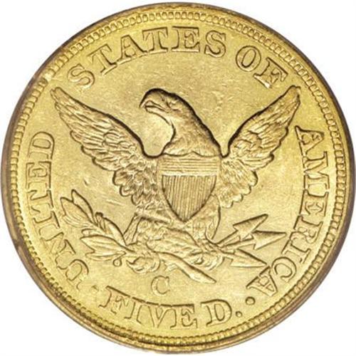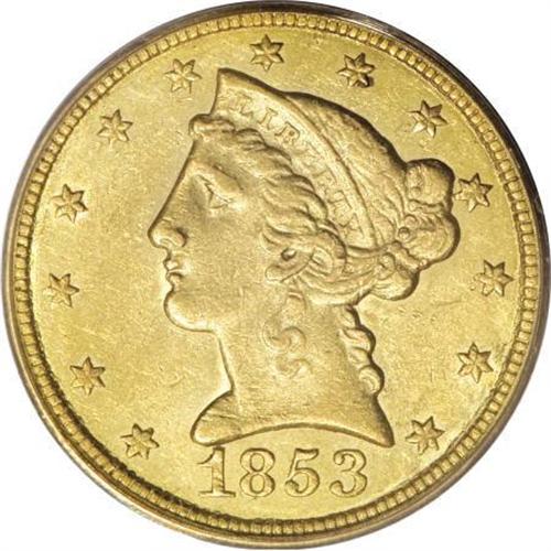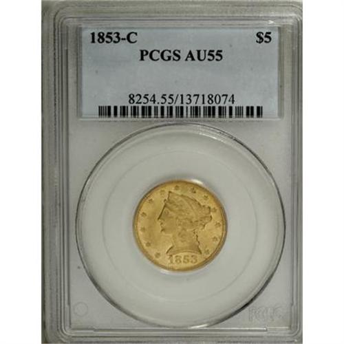 <B>1853-C $5 AU55 PCGS.</B></I> Variety 20-H. Attractive and mostly original in appearance with medium lemon-gold color over mostly lustrous surfaces. There is a well-hidden flaw on the reverse that is located on the eagle's right leg; this is clearly mint-made. There are also a few small ticks seen on the reverse and a tiny mark on the reverse rim at 10:00 may also be mint-made. With the exception of these overlookable faults, this coin is quite pleasing with good detail for the grade.<BR><I>From The Carolina Circle Collection.</B></I><BR><BR><B>Coin Engraver:</B> Christian Gobrecht<BR><BR><b>Shipping:</b> Coins & Currency (<a target="_blank" href="http://www.heritageauctions.com/common/shipping.php">view shipping information</a>)