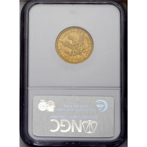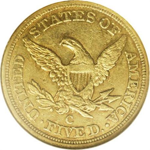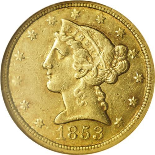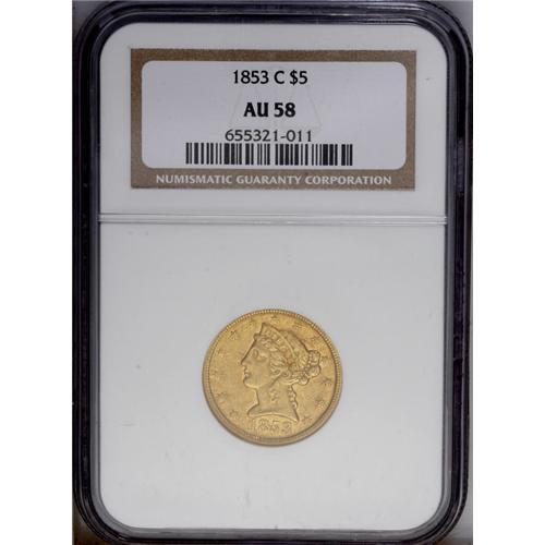 <B>1853-C $5 AU58 NGC.</B></I> Variety 20-H. The 1853-C is one of the more frequently encountered Charlotte half eagles. Estimates of the number of survivors are around 185-195 pieces in all grades. While all C-mint fives are scarce in AU in the absolute sense, the 1853 is one of the better preserved of the Charlotte fives with at least three dozen pieces believed known today. This piece has a significant presence of reddish patina, as well as generous amounts of mint luster, surrounding the devices. Numerous small to medium sized abrasions are peppered across each side.