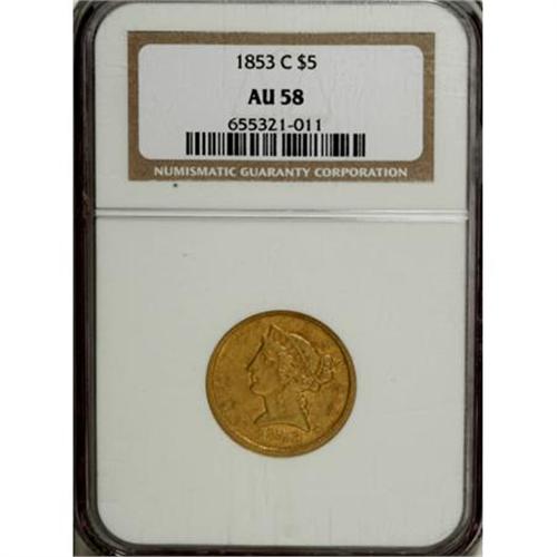 <B>1853-C $5 AU58 NGC.</B></I> Variety 20-H. The 1853-C is one of the more frequently encountered Charlotte half eagles. Estimates of the number of survivors are around 185-195 pieces in all grades. While all C-mint fives are scarce in AU in the absolute sense, the 1853 is one of the better preserved of the Charlotte fives with at least three dozen pieces believed known today. This piece has a significant presence of reddish patina, as well as generous amounts of mint luster, surrounding the devices. Numerous small to medium sized abrasions are peppered across each side.<BR><BR><B>Coin Engraver:</B> Christian Gobrecht<BR><BR><b>Shipping:</b> Coins & Currency (<a target="_blank" href="http://www.heritageauctions.com/common/shipping.php">view shipping information</a>\)