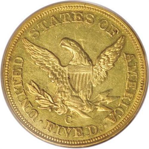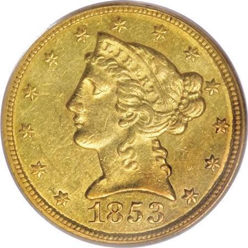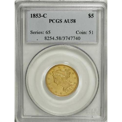 <B>1853-C $5 AU58 PCGS.</B></I> Variety 20-H. Die State I. Predominantly green-gold in color, the surfaces brighten to yellow-gold shades at direct light angles. With the exception of the highpoints of Liberty's hair curls on the obverse and the upper and lower reverse eagle, all devices are boldly defined, and none possess any distractions that are out of context with the assigned grade. Flickers of original luster remain. Population: 10 in 58, 9 finer (6/07).<BR><BR><B>Coin Engraver:</B> Christian Gobrecht<BR><BR><b>Shipping:</b> Coins & Currency (<a target="_blank" href="http://www.heritageauctions.com/common/shipping.php">view shipping information</a>\)