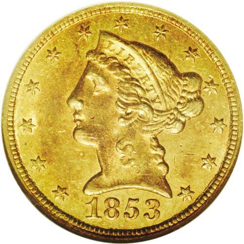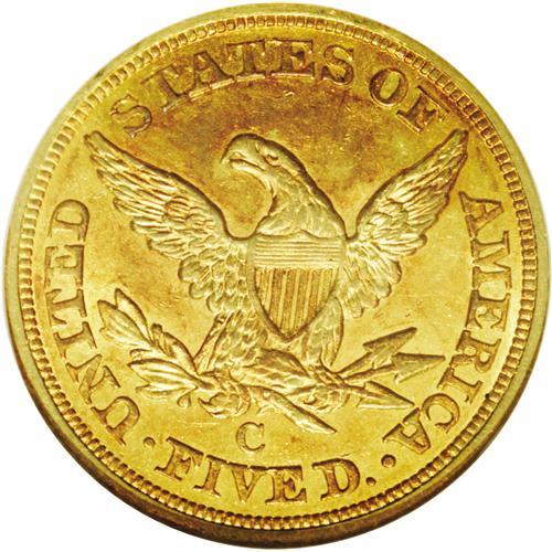 <B>1853-C<$5> MS60 NGC.</B></I> Variety 20-H. A common date Charlotte half eagle with an impressively large mintage of 65,571 pieces. At the MS60 level, this piece is just outside the Condition Census. The striking details on this coin are unusually well defined for a C-mint five, but are in line with other high grade examples of the 1853-C. The surfaces are also free from the heavy abrasions that usually are found on this issue. Each side has an overlay of deep reddish patina that adds even more to the eye appeal of this high grade branch mint issue. In a prior generation holder.