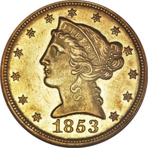 <B>1853-C $5 MS62 NGC. CAC.</B></I> Variety 20-H. The year 1853 was a relatively good one at the Charlotte Mint. The mint managed at least a small mintage of gold dollars, and the Liberty Head half eagle mintage exceeding 65,000 pieces ensured that this issue would remain among the most plentiful of the C-mint fives. The coins were also well-produced, with many examples showing a decent strike, along with good luster and color. This piece shows a few light field abrasions that preclude a finer grade, but the strike is particularly strong on the eagle, and only light weakness shows on the shield stripes. On the obverse all of the star radials are full, and only a hint of lightness shows on the hair curls below ER. The greenish-gold surfaces radiate bold luster and demonstrate considerable prooflikeness. A sharp and attractive example of the issue. Census: 7 in 62, 6 finer (3/08).<BR><BR><B>Coin Engraver:</B> Christian Gobrecht<BR><BR><b>Shipping:</b> Coins & Currency (<a target="_blank" href="http://www.heritageauctions.com/common/shipping.php">view shipping information</a>)