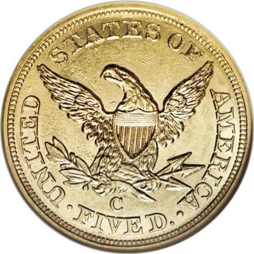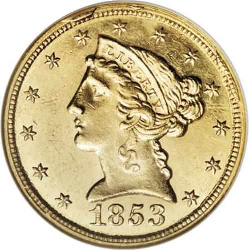 <B>1853-C $5 MS63 NGC.</B></I> Ex: Ashland City. Variety 20-H. Die State I-II. This intermediate die state shows strong definition on the bottom of the mintmark still but the die crack below FIVE is pronounced. The 1853-C is one of the most available C-mint fives, but a high grade example such as this is always an occasion for close scrutiny by Southern gold collectors. Sharply struck overall, the surfaces are bright with glittering yellow-gold coloration. The fields have a confirmed prooflike glimmer and the devices show pronounced satiny mint luster. The most distinctive mark that could be used as a pedigree identifier is a short, shallow angling abrasion between star 2 and the chin of Liberty. A mid to upper Condition Census example of this popular issue.<BR><I>Ex: Ashland City Collection of Branch Mint Gold Coins (Heritage, 1/03), lot 4781.</B></I><BR><I>From The Waxhaw Collection.</B></I><BR><BR><B>Coin Engraver:</B> Christian Gobrecht<BR><BR><b>Shipping:</b> Coins & Currency (<a target="_blank" href="http://www.heritageauctions.com/common/shipping.php">view shipping information</a>)