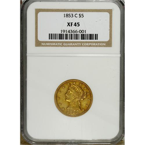 <B>1853-C $5 XF45 NGC.</B></I> Variety 21-H. The fields of this orange-gold example suggest past reflectivity. Well struck with a hint of radiance despite the dulling effects of wear and handling marks.<BR><BR><b>Shipping:</b> Coins & Currency (<a target="_blank" href="http://www.heritageauctions.com/common/shipping.php">view shipping information</a>)