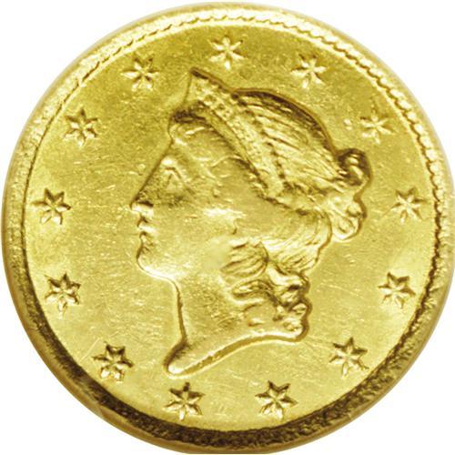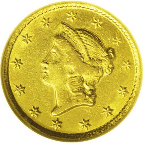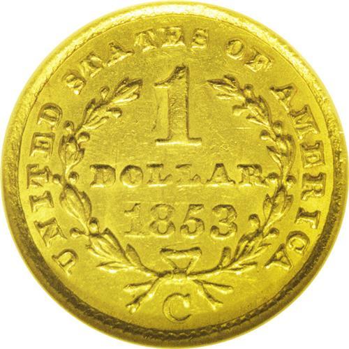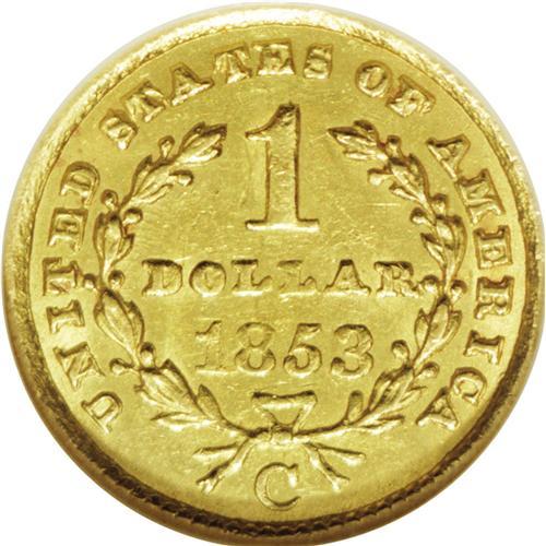 <B>1853-C<G$1> AU53 NGC.</B></I> Variety 8-I. The '53-C is the final Type One gold dollar produced in Charlotte, and it is also a coin that is often found with a poor strike and planchet problems. These problems are minimal on this piece, being limited to portions of Liberty's hair, which is somewhat soft. Otherwise, the surfaces display some luster. There are also a few minor blemishes commensurate with the grade. The reverse is rotated a few degrees counterclockwise. All in all, this piece displays above average quality for the issue.<BR><I>From The Carolina Gold Collection, Part Two.</B></I>