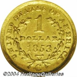 <table><tr><td><table><tr><td>1853-C G$1 AU58 NGC. Variety 8-I. This variety displays a slightly slanting date and no recutting on the C mintmark. The 1853-C is a scarce coin with only 11,515 pieces produced, and is seldom seen above XF. It is also a problem-ridden issue that is often found with a poor strike and numerous planchet problems. This piece exhibits above average definition at the centers, and a couple of small planchet voids are noted on either side. The obverse is a pronounced reddish-gold, the reverse is a subtle green-gold color. Considerable luster still surrounds the devices. <BR><BR><B>Important notice:</B> Heritage usually auctions material at the rate of 200-250 lots per hour. On some occasions eBay Live bid software or the Internet may not be able to keep up with the pace of the auction. We recommend placing a realistic absentee bid now as insurance to avoid disappointment. Occasionally the auctioneer may eliminate or reject an eBay Live bid, and the auctioneer may also reopen a lot after the close of the eBay live bidding (usually because we missed an audience bid), and may reject your bid even if it shows you as the winning bidder. By bidding via eBay Live, you agree that Heritage may award the lot to another bidder at its sole discretion under the circumstances described above or any other reasonable circumstances. Since eBay bids are not shown to us until we open the lot on the floor, we treat those bids just like floor bids. In most cases the floor responds before the eBay bid is presented to us, due to Internet lag time, so for consistency we have made it a policy that floor bids are always considered first over tie eBay live bids. Also please note that all Heritage lots purchased through eBay Live carry a 20% Buyer's Premium. Please make sure you read the Terms and Conditions before you bid. <BR><BR><B>IMPORTANT ANNOUNCEMENT ABOUT RESERVES:</B> Heritage now divulges all reserves on its web site 7 days before every auction. If you want to know whether the reserve on this lot has been met, and if not, what the reserve amount is, please visit this lot page on the HeritageCoin.com web site, or email: bid@HeritageGalleries.com </span></font></td></tr></table></td></tr></table>
