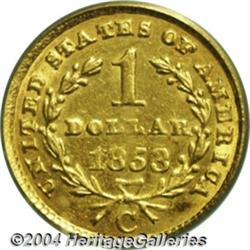 <table><tr><td><table><tr><td>1853-C G$1 AU58 PCGS. Variety 8-I. The 1853-C is a scarce coin with only 11,515 pieces produced, and is seldom seen above XF. It is also a problem-ridden issue that is often found with a poor strike and planchet problems. This piece is softly defined on Liberty's hair curls, and a faint diagonal pinscratch is detected on the obverse from 10 o'clock to the top of Liberty's crown. The surfaces are a reddish-gold color with considerable luster still surrounding the devices. <BR><BR><B>Important notice:</B> Heritage usually auctions material at the rate of 200-250 lots per hour. On some occasions eBay Live bid software or the Internet may not be able to keep up with the pace of the auction. We recommend placing a realistic absentee bid now as insurance to avoid disappointment. Occasionally the auctioneer may eliminate or reject an eBay Live bid, and the auctioneer may also reopen a lot after the close of the eBay live bidding (usually because we missed an audience bid), and may reject your bid even if it shows you as the winning bidder. By bidding via eBay Live, you agree that Heritage may award the lot to another bidder at its sole discretion under the circumstances described above or any other reasonable circumstances. Since eBay bids are not shown to us until we open the lot on the floor, we treat those bids just like floor bids. In most cases the floor responds before the eBay bid is presented to us, due to Internet lag time, so for consistency we have made it a policy that floor bids are always considered first over tie eBay live bids. Also please note that all Heritage lots purchased through eBay Live carry a 20% Buyer's Premium. Please make sure you read the Terms and Conditions before you bid. <BR><BR><B>IMPORTANT ANNOUNCEMENT ABOUT RESERVES:</B> Heritage now divulges all reserves on its web site 7 days before every auction. If you want to know whether the reserve on this lot has been met, and if not, what the reserve amount is, please visit this lot page on the HeritageCoin.com web site, or email: bid@HeritageGalleries.com </span></font></td></tr></table></td></tr></table>