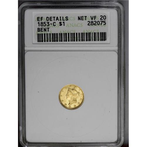 <B>1853-C<G$1>--Bent--ANACS. XF Details. Net VF20.</B></I> Variety 8-I. Bent above the mintmark, and a few moderate marks are located beneath a loupe. Remaining luster is substantial, though Liberty's hair displays light wear. Just 11,515 pieces were struck.<BR><I>From The Steve Glenn Collection.</B></I> <BR><BR><B>Important notice:</B> Heritage usually auctions material at the rate of 200-250 lots per hour. On some occasions eBay Live bid software or the Internet may not be able to keep up with the pace of the auction. We recommend placing a realistic absentee bid now as insurance to avoid disappointment. Occasionally the auctioneer may eliminate or reject an eBay Live bid, and the auctioneer may also reopen a lot after the close of the eBay live bidding (usually because we missed an audience bid), and may reject your bid even if it shows you as the winning bidder. By bidding via eBay Live, you agree that Heritage may award the lot to another bidder at its sole discretion under the circumstances described above or any other reasonable circumstances. Since eBay bids are not shown to us until we open the lot on the floor, we treat those bids just like floor bids. In most cases the floor responds before the eBay bid is presented to us, due to Internet lag time, so for consistency we have made it a policy that floor bids are always considered first over tie eBay live bids. Also please note that all Heritage lots purchased through eBay Live carry a 20% Buyer's Premium. Please make sure you read the Terms and Conditions before you bid. This lot is being auctioned in conjunction with a live floor auction by Heritage Galleries & Auctioneers. All final auction and invoice information will be supplied by Heritage Galleries & Auctioneers, and all other information should be considered preliminary. Lot:2265 <BR><BR><B>Winning Notification and Billing:</B> After the FINAL session in this auction is complete, Heritage will send e-mail and snail mail invoices. This process normally takes several days. All final auction and invoice information will be supplied by Heritage Galleries & Auctioneers, and all other information should be considered preliminary. <BR><BR>This auction will be conducted on a live auction floor and over the Internet through eBay Live. If you choose to place an absentee bid, please take a moment to <font color='#0000ff'><u><a href='http://pages.ebay.com/liveauctions/help/before/laabsentee.html'>learn how eBay Live absentee bidding works</a></u></font><font color='#000000'>