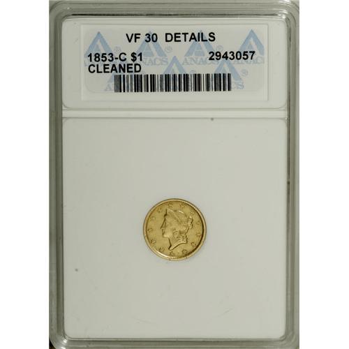 <B>1853-C G$1 --Cleaned--ANACS. VF30 Details.</B></I> Variety 8-I. Unduly bright for a mid-grade gold dollar, although the lack of detail on the hair near the ear is partly due to the strike. A tiny obverse dig is noted near 6 o'clock. A collectible example of this scarce C-mint issue.<BR><BR><b>Shipping:</b> Coins & Currency (<a target="_blank" href="http://www.heritageauctions.com/common/shipping.php">view shipping information</a>)