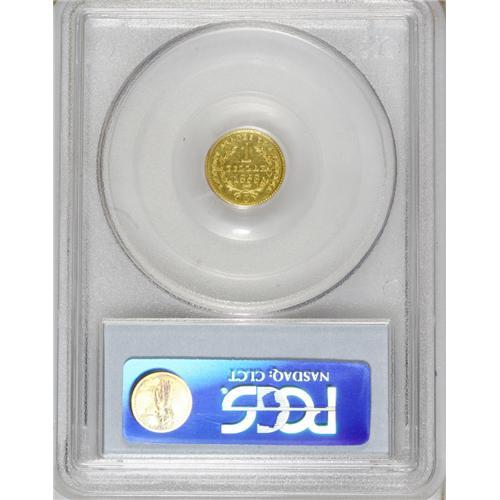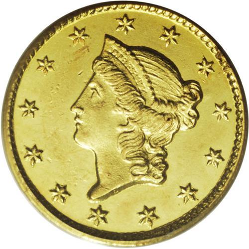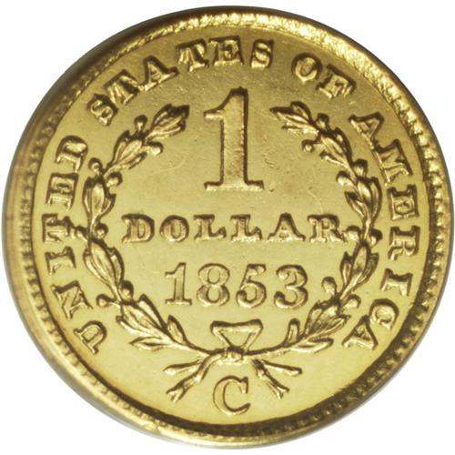 <B>1853-C G$1 MS62 PCGS.</B></I> Variety 8-I. According to Garrett and Guth (2006): "The 1853-C gold dollars were very poorly produced."..."The central portions on the reverse near the date are nearly always obscured." This example would seem to be an exception to that observation, as there is <I>no</B></I> striking weakness noticeable on the reverse; nor on the obverse for that matter. The green-gold surfaces are satiny and abrasion-free, with a few minute hairlines in the fields that prevent a higher grade assessment. Population: 8 in 62, 2 finer (2/07).<BR><BR><b>Shipping:</b> Coins & Currency (<a target="_blank" href="http://www.heritageauctions.com/common/shipping.php">view shipping information</a>)