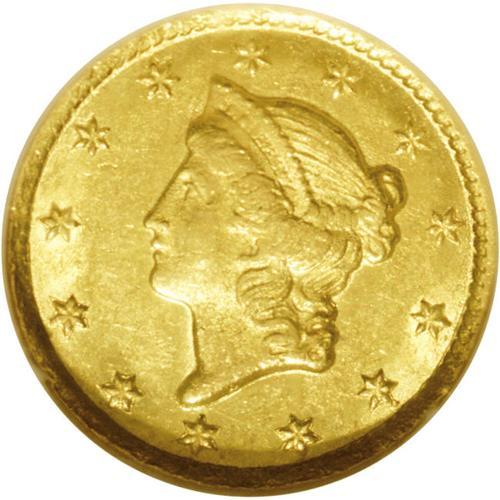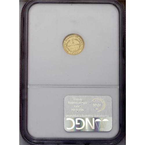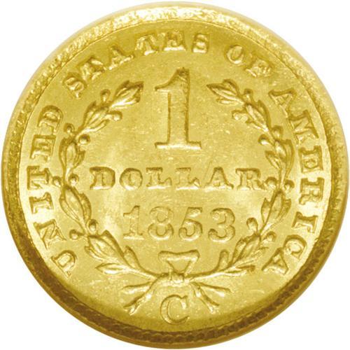 <B>1853-C G$1 MS63 NGC.</B></I> Variety 8-I. This coin is not specifically mentioned in Winter's Condition Census listing for the 1853-C Gold Dollar, but, nevertheless, we feel confident that it is fully deserving of that distinction. The strike on both sides of this coin is characteristic of this poorly produced issue. There is some softness of detail on the obverse over Liberty's brow and on the reverse over the date and the second L in DOLLAR. There are also a few isolated areas of striking incompleteness around the borders. That said, we stress that this coin is truly exceptional for the issue in the realm of surface preservation. The fields are semi-reflective--a feature that suggests a modest prooflike finish. Rich green-gold color flows over both sides, neither of which reveals an excessive number of abrasions. A small pinprick near Liberty's eye, however, is noted as a pedigree marker.