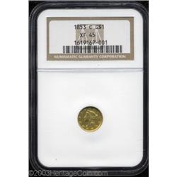 <TABLE cellSpacing=0 cellPadding=0 width="100%" bgColor=#000000 border=0><TBODY><TR><TD width="100%"><TABLE cellSpacing=1 cellPadding=3 width="100%" border=0><TBODY><TR><TD width="100%" bgColor=#79735c><FONT face=arial color=#ffffff size=3><B>Description</B> </FONT></TD></TR><TR><TD width="100%" bgColor=#ffffff><FONT face=arial size=2><B>1853-C G$1 XF45 NGC.</B></I> A scarce and often poorly produced Type One Charlotte issue, one of just 11,515 pieces struck in the final year of C-mint gold dollars. This coin does not show all of the planchet problems frequently seen on examples from this year, but the strike is somewhat soft on the hair curls and the date. The surfaces show a few small abrasions, and several heavier marks on the upper reverse. The color is a medium greenish-gold, and there is a thin coating of luster still clinging to each side. </FONT></TD></TR></TBODY></TABLE></TD></TR></TBODY></TABLE><BR><A name=PricesRealized></A><TABLE cellSpacing=0 cellPadding=0 width="100%" bgColor=#000000 border=0><TBODY><TR><TD width="100%"><TABLE cellSpacing=1 cellPadding=3 width="100%" border=0><TBODY><TR><TD width="100%" bgColor=#79735c><A name=PR><FONT face=arial color=#ffffff size=3><B>Previous Prices from Heritage Auctions</B> </FONT></A></TD></TR><TR><TD bgColor=#f6f6ed><TABLE cellSpacing=0 cellPadding=0 width="100%" border=1><TBODY><TR><TD align=middle width="33%"><B>Date</B></TD><TD align=middle width="33%"><B>Service</B></TD><TD align=middle width="33%"><B>Price</B></TD></TR><TR bgColor=whitesmoke><TD width="33%"><B>06/06/1997</B></TD><TD width="33%">PCGS</TD><TD width="33%">$1,006.25</TD></TR></TBODY></TABLE></TD></TR><TR><TD bgColor=#ffffff><FONT face=arial size=1 ?>PLEASE NOTE: All prices realized reflect the final hammer price PLUS the buyer's premium in auctions that charge a buyer's premium. Each item has a notation at the top of the listing indicating whether that lot included a buyer's premium. Example: A item that sells with a final hammer price of $100 and a 20% buyer's premium will display with a price realized of $120. All information listed is intended to be as accurate as possible, but errors are possible. Please use this guide carefully and inform us of any inaccuracies. </FONT></TD></TR></TBODY></TABLE></TD></TR></TBODY></TABLE><BR><TABLE cellSpacing=0 cellPadding=0 width="100%" bgColor=#000000 border=0><TBODY><TR><TD width="100%"><TABLE cellSpacing=1 cellPadding=3 width="100%" border=0><TBODY><TR><TD width="100%" bgColor=#79735c colSpan=6><FONT face=arial color=#ffffff size=3><B>Price Guide*</B> </FONT></TD></TR><TR bgColor=#f6f6ed><TD align=middle><B>Grade</B> </TD><TD align=middle><B>Coin World<BR>(Trends)</B> </TD><TD align=middle><B>Numismedia<BR>Retail</B> </TD><TD align=middle><B>Numismedia<BR>Wholesale</B> </TD><TD align=middle><B>Coin<BR>Universe</B> </TD><TD align=middle><B>Heritage<BR>Value Index</B> </TD></TR><TR bgColor=#ffffff><TD align=middle>40</TD><TD align=right>$1,400.00</TD><TD align=right>---</TD><TD align=right>$1,250.00</TD><TD align=right>$1,300.00</TD><TD align=right>$915.00</TD></TR><TR style="FONT-WEIGHT: bold" bgColor=#cccfdd><TD align=middle>45</TD><TD align=right>---</TD><TD align=right>---</TD><TD align=right>---</TD><TD align=right>---</TD><TD align=right>$1,088.06</TD></TR><TR bgColor=#ffffff><TD align=middle>50</TD><TD align=right>$2,000.00</TD><TD align=right>---</TD><TD align=right>$1,500.00</TD><TD align=right>---</TD><TD align=right>$1,261.11</TD></TR><TR bgColor=#ffffff><TD colSpan=6><FONT size=1>*All information listed is intended to be as accurate as possible, but errors are possible. No item may be returned or refused based on this information which is provided as a service to our customers. You should contact each pricing source directly to determine the accuracy of this information. </FONT></TD></TR></TBODY></TABLE></TD></TR></TBODY></TABLE><BR><TABLE cellSpacing=0 cellPadding=0 width="100%" bgColor=#000000 border=0><TBODY><TR><TD width="100%"><TABLE cellSpacing=1 cellPadding=3 width="100%" border=0><TBODY><TR><TD width="100%" bgColor=#79735c><FONT face=arial color=#ffffff size=3><B>Population Guide</B> </FONT></TD></TR><TR bgColor=#ffffff><TD align=middle><!-- Begin Output of Population Grid--><TABLE cellSpacing=0 cellPadding=0 width="100%" border=0><TBODY><TR><TD vAlign=center><TABLE cellSpacing=0 width="100%" border=1 cellsadding="3"><TBODY><TR><TD vAlign=center><TABLE cellSpacing=0 cellPadding=3 width="100%" border=1><TBODY><TR><TD vAlign=center align=middle bgColor=#f0f1e8 colSpan=2 <CENTER><FONT face=Arial size=2><B>PCGS Pop </B></FONT><CENTER></CENTER></TD><TD vAlign=center align=middle bgColor=#f0f1e8 colSpan=2><CENTER><FONT face=Arial size=2><B>NGC Pop</B></CENTER></FONT></TD></TR><TR><TD vAlign=center><FONT face=Arial size=2>(45)</FONT> </TD><TD vAlign=center align=right><FONT face=Arial size=2>8</FONT> </TD><TD vAlign=center><FONT face=Arial size=2>(45)</FONT> </TD><TD vAlign=center align=right><FONT face=Arial size=2>3</FONT> </TD></TR><TR><TD vAlign=center><FONT face=Arial size=2>(>45)</FONT> </TD><TD vAlign=center align=right><FONT face=Arial size=2>52</FONT> </TD><TD vAlign=center><FONT face=Arial size=2>(>45)</FONT> </TD><TD vAlign=center align=right><FONT face=Arial size=2>73</FONT> </TD></TR></TBODY></TABLE></TD></TR></TBODY></TABLE></TD></TR></TBODY></TABLE><!-- End Output of Population Grid--> Important notice: Heritage usually auctions material at the rate of 200-250 lots per hour. On some occasions eBay Live bid software or the Internet may not be able to keep up with the pace of the auction. We recommend placing a realistic absentee bid now as insurance to avoid disappointment. Occasionally the auctioneer may eliminate or reject an eBay Live bid, and the auctioneer may also reopen a lot after the close of the eBay live bidding (usually because we missed an audience bid), and may reject your bid even if it shows you as the winning bidder. By bidding via eBay Live, you agree that Heritage may award the lo