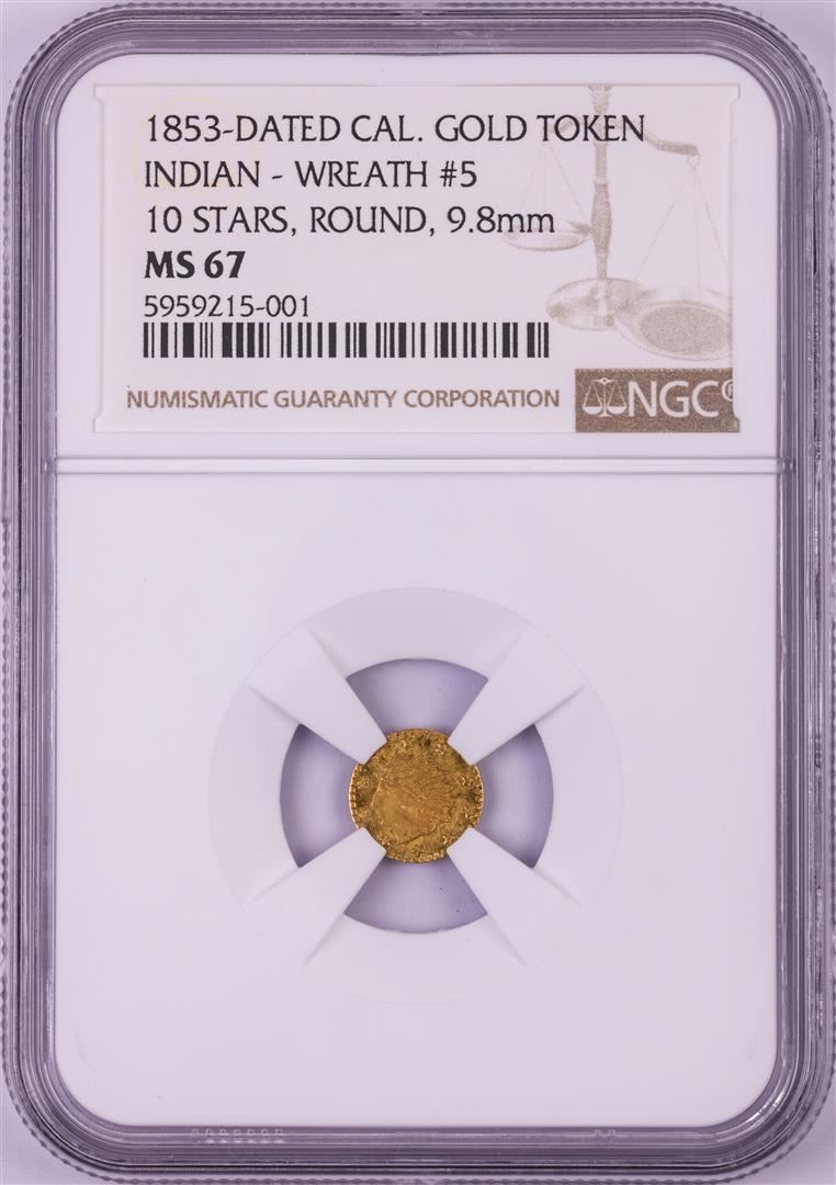 One 1853 California Gold Token Indian Wreath #5 10 Stars NGC MS67. NGC Certified.